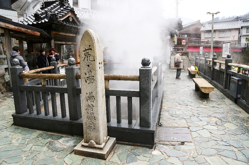 98度のお湯を、1分間に約2,300リットルも湧出する日本有数の湯村温泉。